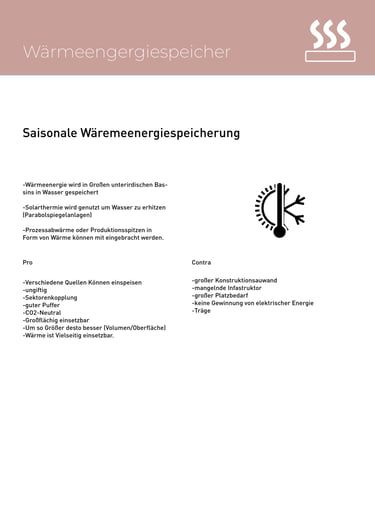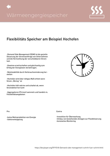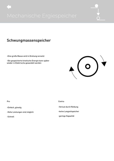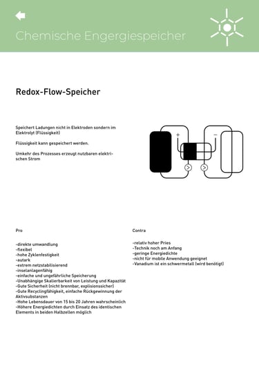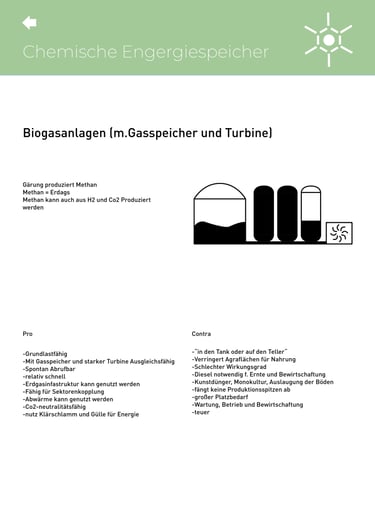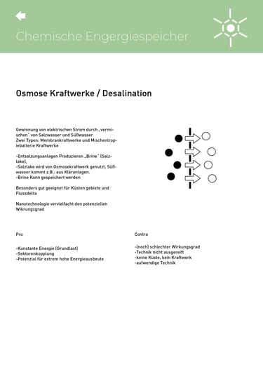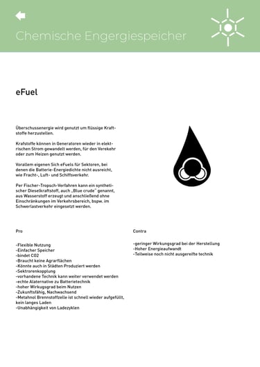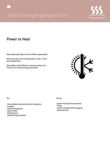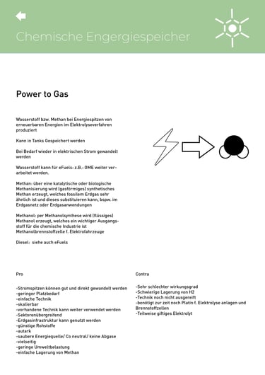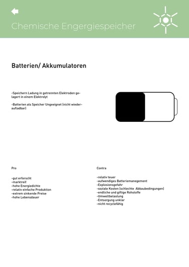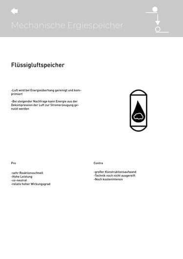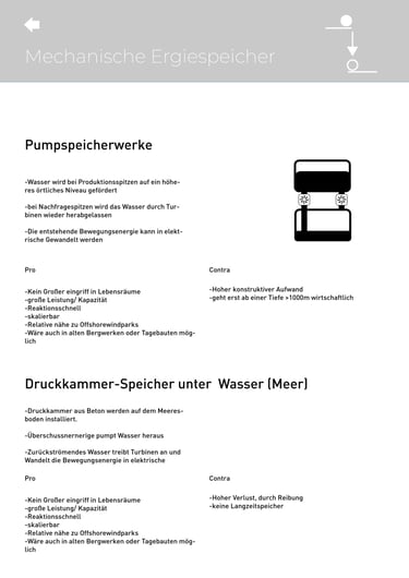 Energiespeicher Wer auf der zweiten Seite auf eine der Energiespeicher klickt, gelangt zu dem dazugehörigen Plakaten. Sie sind alle im gleichen Layout und nehmen sich gestalterisch zurück. Die Art des Speichers wird kurz erklärt und die Pro- und Kontraargumente werden einander gegenübergestellt.