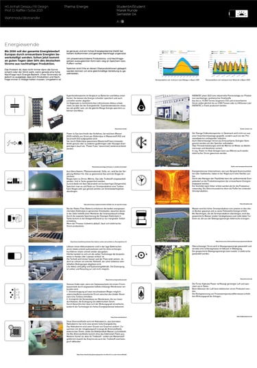 Energiewende Die Energiewende bildet den Inhalt der zweiten Seite. Wie kann sie gelingen, wo liegen die Schwierigkeiten? Das Plakat gibt Einblick in die verschiedenen Arten Energie zu speichern, denn eines der größten Probleme bei der lückenlosen Versorgung mit Strom sind die phasenverschobenen Produktions- und Nachfragespitzen. Anders als die Natur richtet sich die Menschheit nicht nach dem Takt des Tages und des Wetters. Dadurch entstehend teilweise „Überproduktionen“ von Strom, sodass die Anlagen für die sog. erneuerbare Energie abgestellt werden müssen und ihr Potenzial ungenutzt bleibt. Dennoch gibt es Versorgungsengpässe, wenn die Sonne weniger auf die Photovoltaikanlage scheint, oder der Wind die Räder nicht dreht.