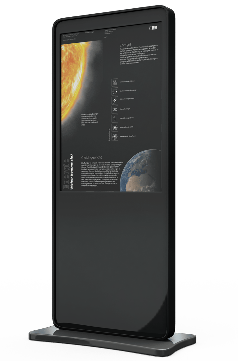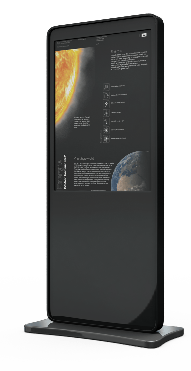 Bionik bedeutet Konzepte der Natur für technische Innovationen zu adaptieren. Der natürlichen Energiekreislaufs ist das Vorbild dieser Forschungsarbeit. Das Interaktiven Plakat visualisiert den Ursprung, die Wandlung und der Nutzen von Energie. Dieses Plakat begleitet außerdem einen ca. 20 minütigen Vortrag zu dem Thema.