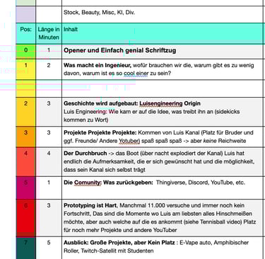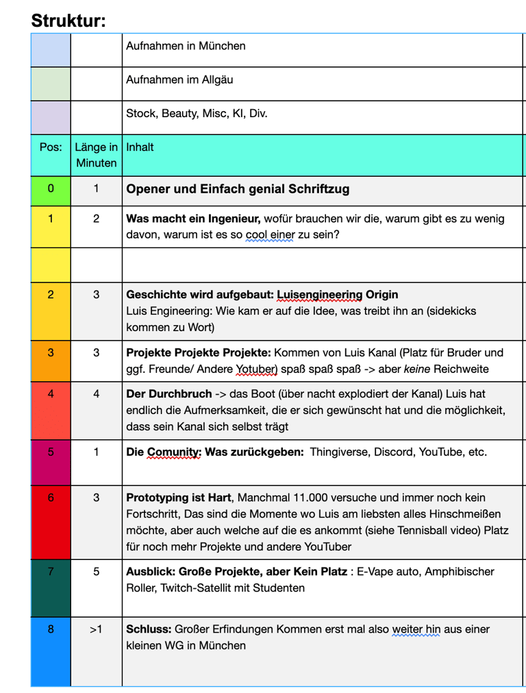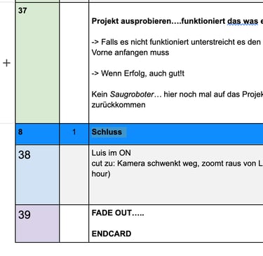 Um den Überblick zu vereinfachen, habe ich für alle Dokumente Farbcodes entwickelt und Legenden angelegt, damit alle sich schnell und einfach darin zurechtfinden. Kapitel, Szenen, Drehorte und Drehtage bekamen jeweils eine bestimmte Farbe zugewiesen. Dieser Farbcode hat sich auch beim Dreh als extrem praktisch erwiesen. Die gesamte Vorbereitung hat Online über Google-Docs stattgefunden, damit alle Beteiligten jeder Zeit kommentieren und korrigieren konnten.