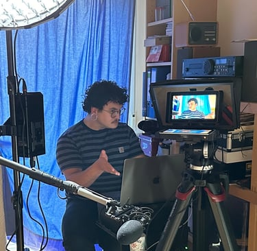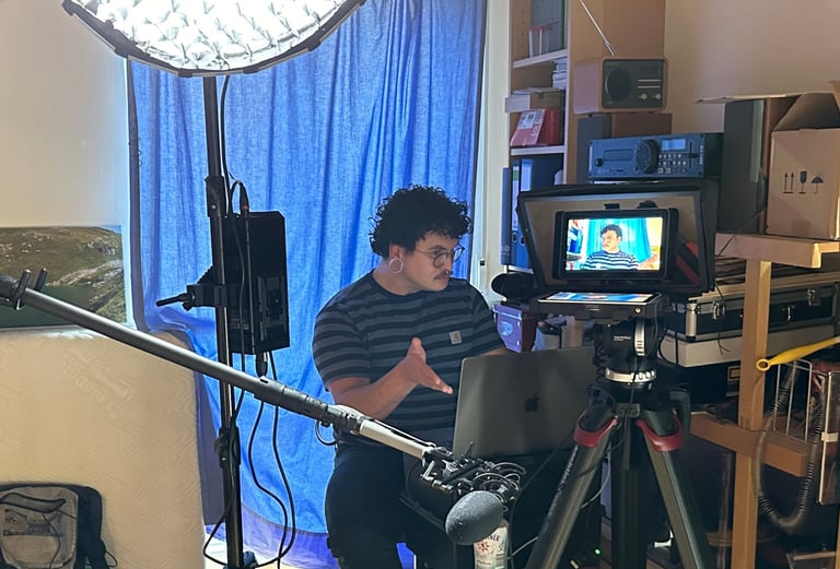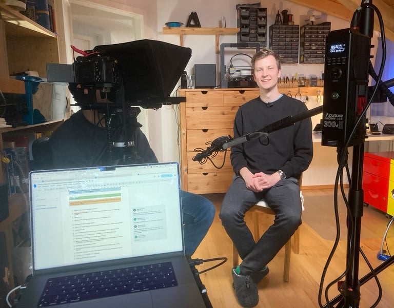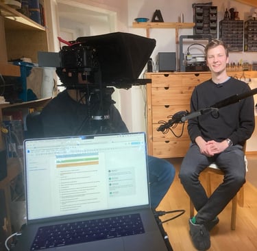 Nicht alle Protagonist*Innen sind so vertraut im Umgang mit Kameras wie Luis. Das Direct-Eye-System hilft beim Interview dabei, dass die Befragten in die Kamera schauen. Die befindet sich hinter einem halbdurchlässigen Spiegel, in dem für ihn nur das Gesicht des Interviewers zu sehen ist. In Verbindung mit meiner Laptop-Kamera, habe ich so sogar immer alle Fragen direkt vor mir und kann mir sogar Notizen machen.